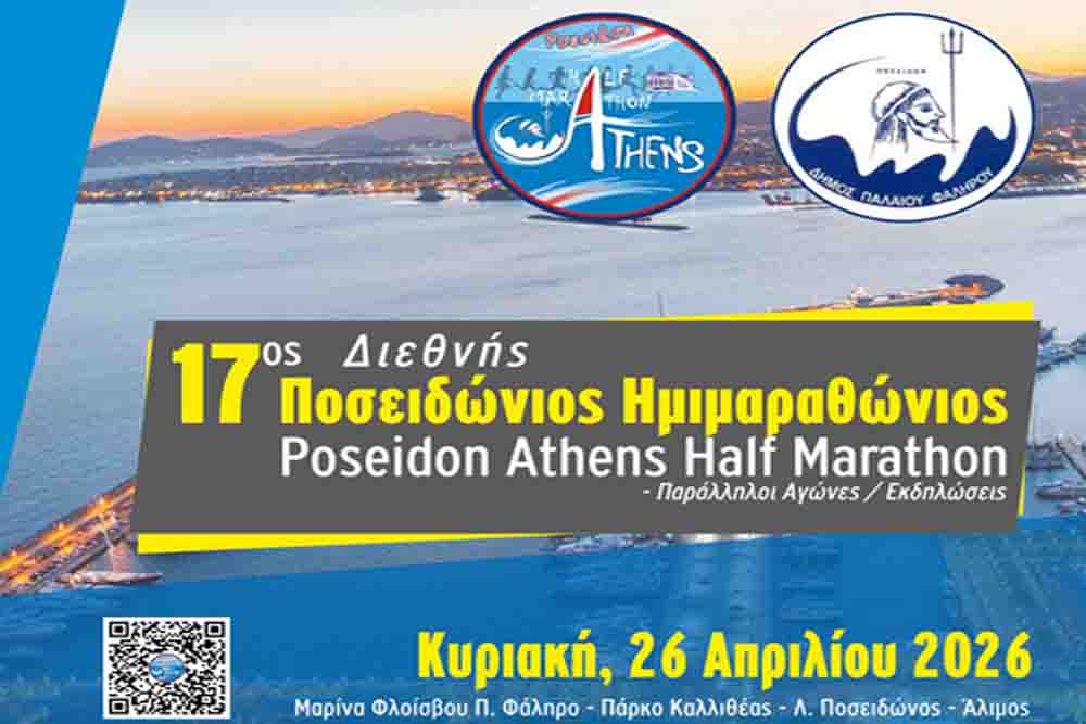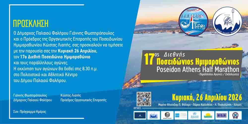 Ο Δήμαρχος Παλαιού Φαλήρου Γιάννης Φωστηρόπουλος και ο Πρόεδρος της Οργανωτικής Επιτροπής του Ποσειδωνίου Ημιμαραθωνίου Κώστας Λιαπής, προσκαλούν τους πολίτες να τιμήσουν με την παρουσία τους τον 17ο Διεθνή Ποσειδώνιο Ημιμαραθώνιο και τους παράλληλους αγώνες και εκδηλώσεις, που θα πραγματοποιηθούν την Κυριακή 26 Απριλίου 2026 στο Παλαιό Φάληρο.