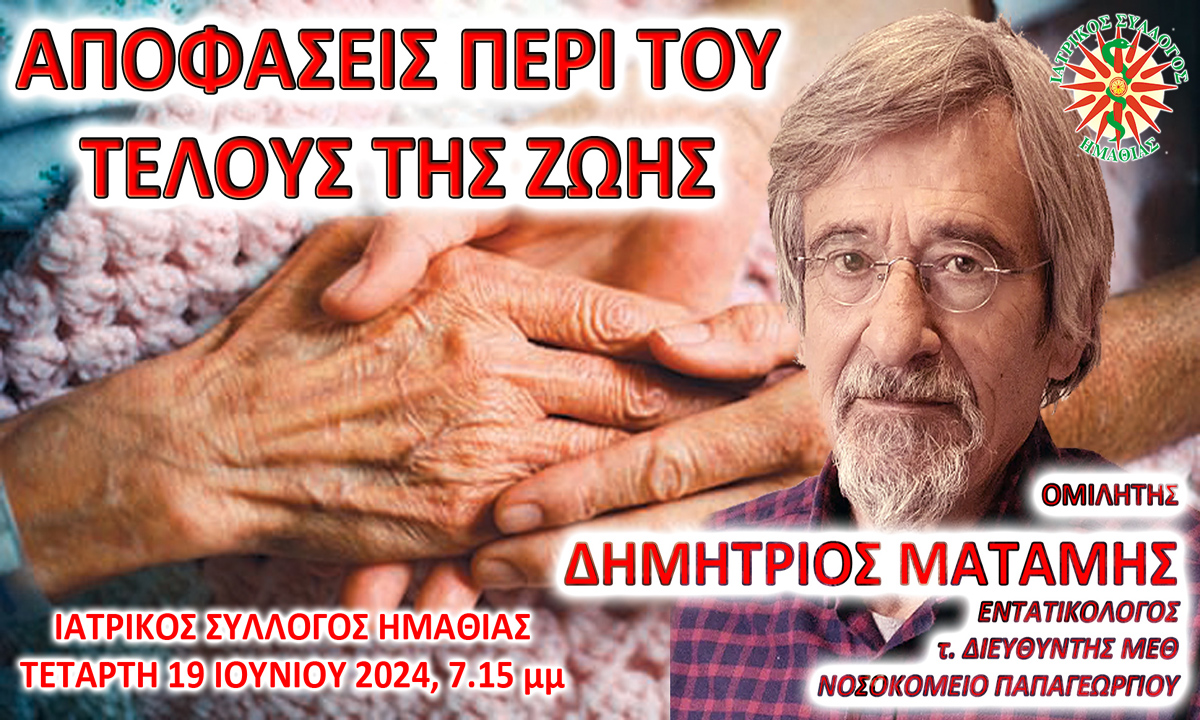 Με την εξέλιξη της ιατρικής τεχνολογίας σήμερα, η Ιατρική μπορεί να παρατείνει τη διάρκεια της ζωής αλλά όχι αναγκαστικά και την ποιότητα της ζωής. Η διαχείριση των αποφάσεων στο τέλος της ζωής είναι ένα από τα πιο κρίσιμα και ευαίσθητα κοινωνικά και ιατρικά ζητήματα. Για τον λόγο αυτό, ο Ιατρικός Σύλλογος Ημαθίας (ΙΣΗ) διοργανώνει την Τετάρτη, 19 […]