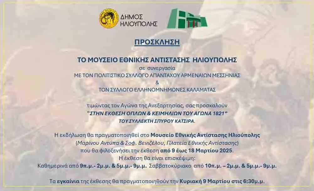 Το Μουσείο Εθνικής Αντίστασης Ηλιούπολης, σε συνεργασία με τον Πολιτιστικό Σύλλογο Απανταχού Αρμεναίων Μεσσηνίας & τον Σύλλογο Ελληνομνήμονες Καλαμάτας, τιμώντας τον Αγώνα της Ανεξαρτησίας, διοργανώνει την «Έκθεση Όπλων & Κειμηλίων του Αγώνα 1821» του συλλέκτη Σπύρου Κατσίρα. Εγκαίνια: Κυριακή 9 Μαρτίου 2025, ώρα 18:30 Μουσείο Εθνικής Αντίστασης, Μαρίνου Αντύπα και Σοφοκλή Βενιζέλου, Ηλιούπολη. Την έκθεση […]