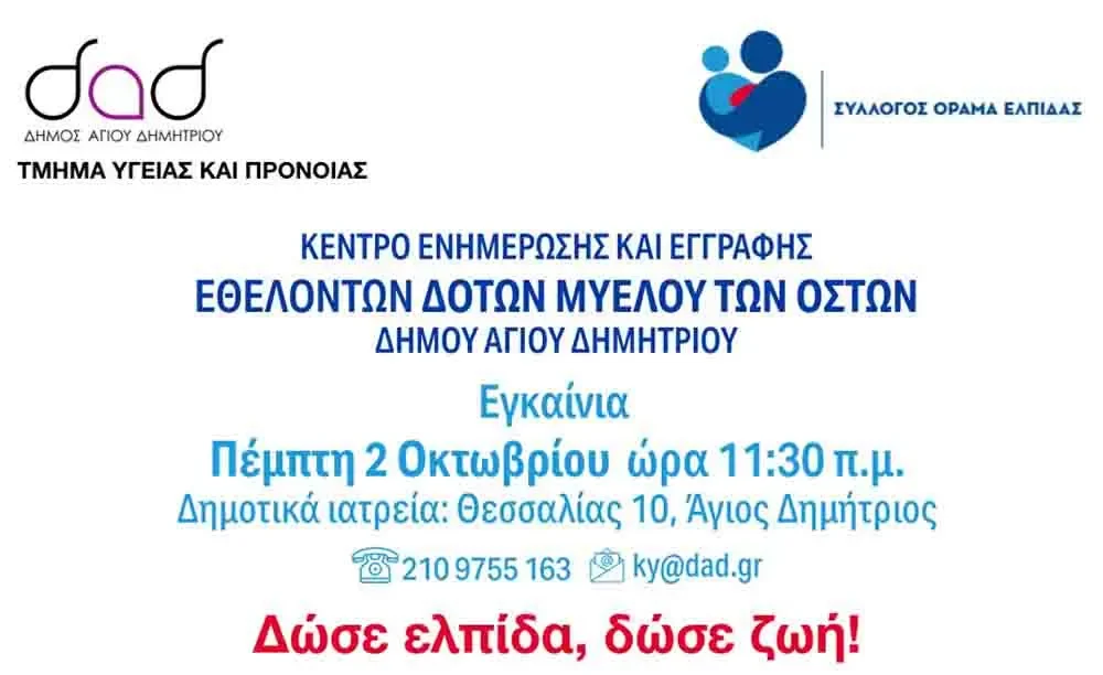 Δήμος Αγίου Δημητρίου: Σε λειτουργία το Κέντρο Ενημέρωσης και Εγγραφής Εθελοντών Δοτών Μυελού των Οστών
