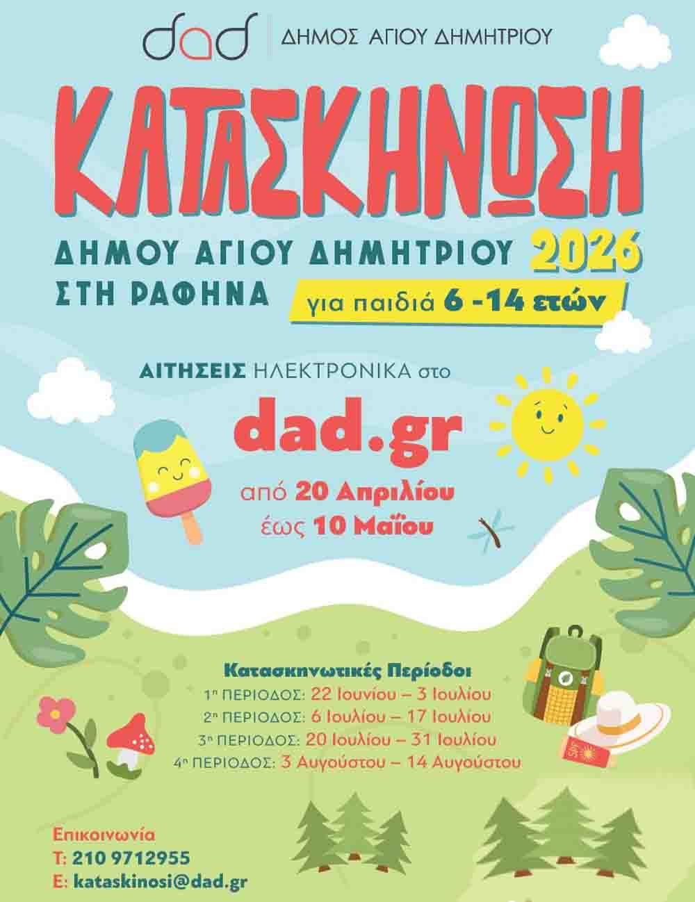 Ο Δήμος Αγίου Δημητρίου ανακοινώνει ότι από σήμερα, Δευτέρα 20 Απριλίου 2026, αρχίζει η υποβολή αιτήσεων για τη συμμετοχή των παιδιών στο κατασκηνωτικό πρόγραμμα του καλοκαιριού 2026.