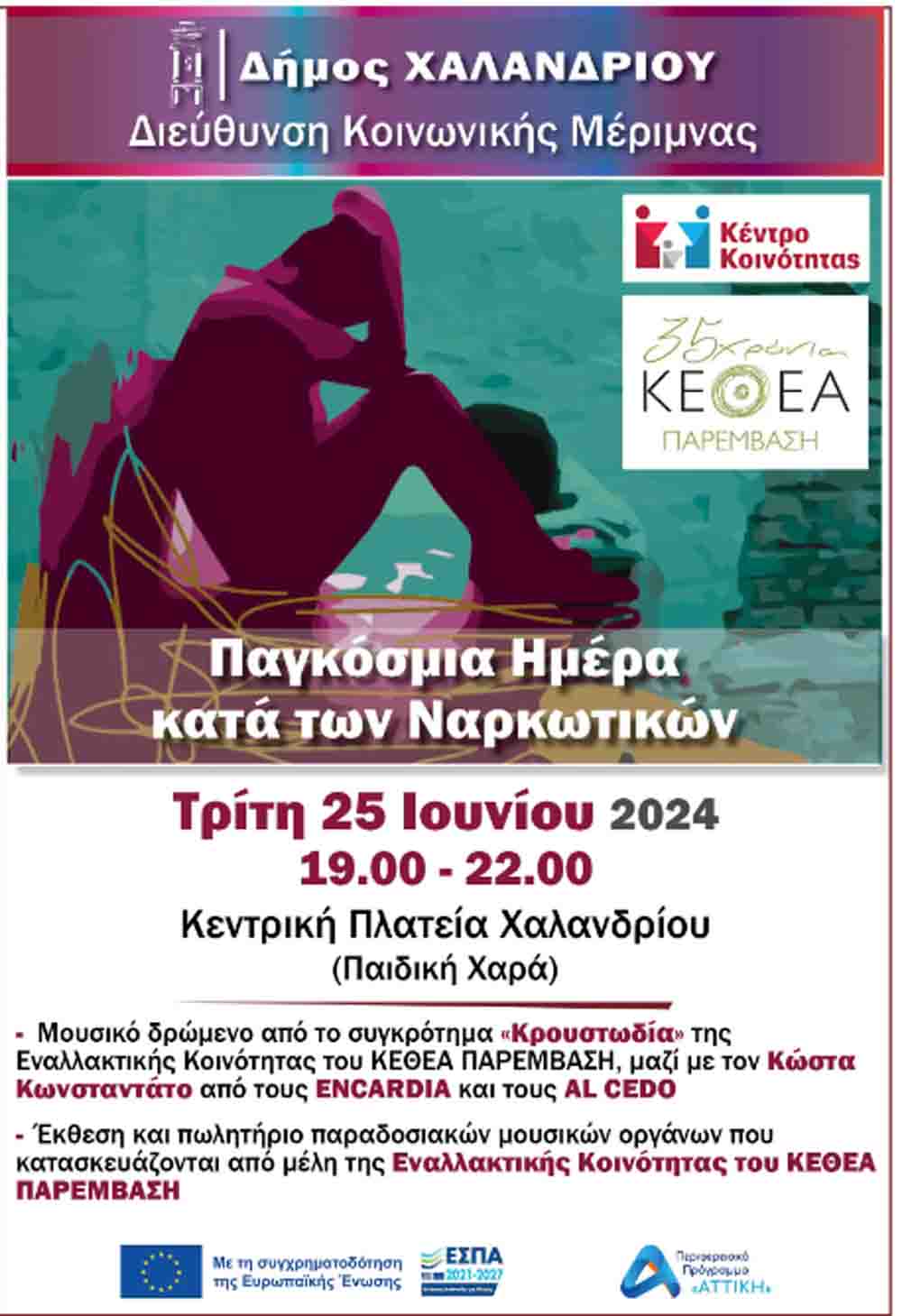Με αφορμή την Παγκόσμια Ημέρα κατά των Ναρκωτικών ο δήμος Χαλανδρίου και το Κέντρο Κοινότητας – Παράρτημα Ρομά, σε συνεργασία με το ΚΕΘΕΑ ΠΑΡΕΜΒΑΣΗ, πραγματοποιούν εκδήλωση ευαισθητοποίησης στην κεντρική πλατεία Χαλανδρίου, στις 25 Ιουνίου 2024, από 19.00 έως 22.00.