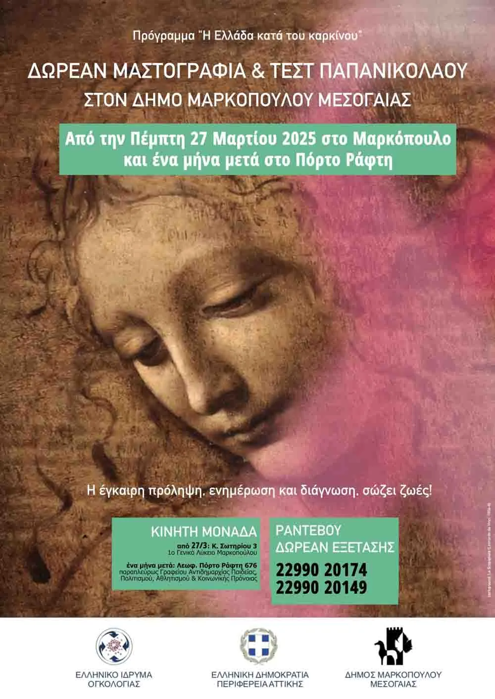 Με ιδιαίτερη χαρά σας πληροφορούμε, ότι στο πλαίσιο του προγράμματος «Η ΕΛΛΑΔΑ ΚΑΤΑ ΤΟΥ ΚΑΡΚΙΝΟΥ», το «ΕΛΛΗΝΙΚΟ ΙΔΡΥΜΑ ΟΓΚΟΛΟΓΙΑΣ» και μετά από αίτημα της Κοινωνικής Υπηρεσίας του Δήμου Μαρκοπούλου το οποίο έγινε αποδεκτό και το οποίο πραγματοποιήθηκε κατόπιν πρωτοβουλίας της Αντιδημάρχου Παιδείας, Κοινωνικής Πολιτικής και Αλληλεγγύης, Παιδικής Μέριμνας & Οικογένειας, Αθλητισμού και Νεολαίας Μένης Βαμποράκη, τόσο σε επίπεδο πρόληψης της υγείας, όσο και συμβολικά για την ανάδειξη της φετινής Ημέρας της Γυναίκας στις 8 Μαρτίου, ξεκινά υπό την αιγίδα της Περιφέρειας Αττικής, για τέταρτη φορά (4η φάση εξετάσεων), πρόγραμμα πληθυσμιακού ελέγχου για την πρόληψη και έγκαιρη διάγνωση των κακοηθών όγκων μαστού και τραχήλου της μήτρας, στις γυναίκες που κατοικούν μόνιμα στον Δήμο Μαρκοπούλου Μεσογαίας.