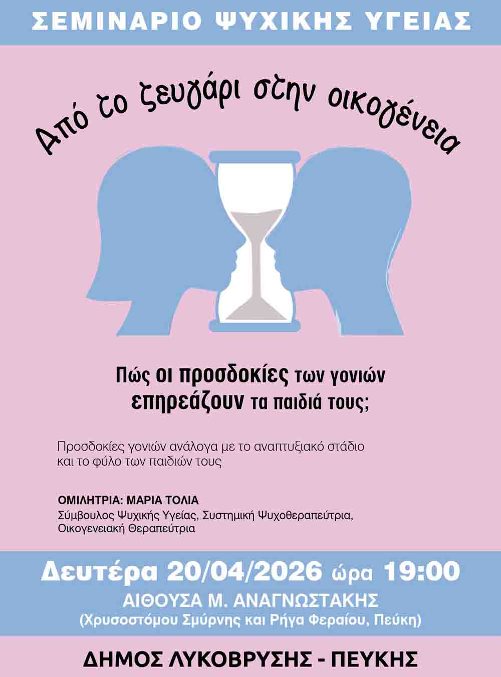 Η εκδήλωση θα πραγματοποιηθεί τη Δευτέρα 20 Απριλίου 2026, στις 19:00, στην αίθουσα «Μ. Αναγνωστάκης» στην Πεύκη και εντάσσεται σε έναν κύκλο δράσεων που εστιάζουν στις οικογενειακές και συντροφικές σχέσεις. Η επιλογή της θεματολογίας δεν είναι τυχαία. Σε μια περίοδο όπου οι κοινωνικές πιέσεις, οι απαιτήσεις της καθημερινότητας και οι μεταβαλλόμενοι ρόλοι μέσα στην οικογένεια δημιουργούν νέα δεδομένα, η κατανόηση της δυναμικής γονέα-παιδιού καθίσταται κρίσιμη.