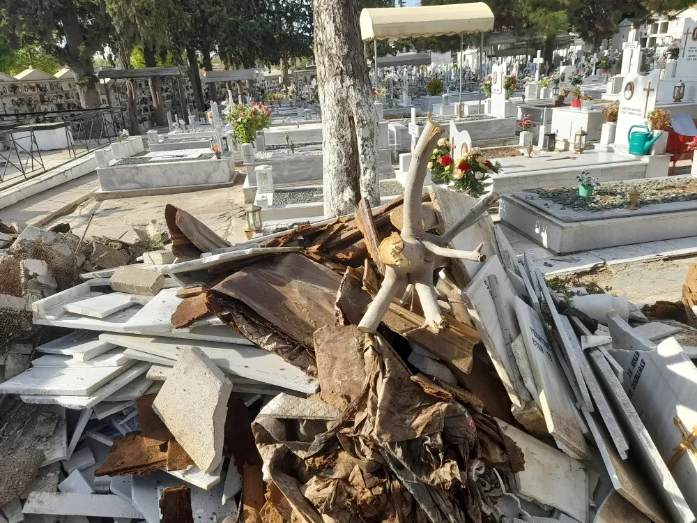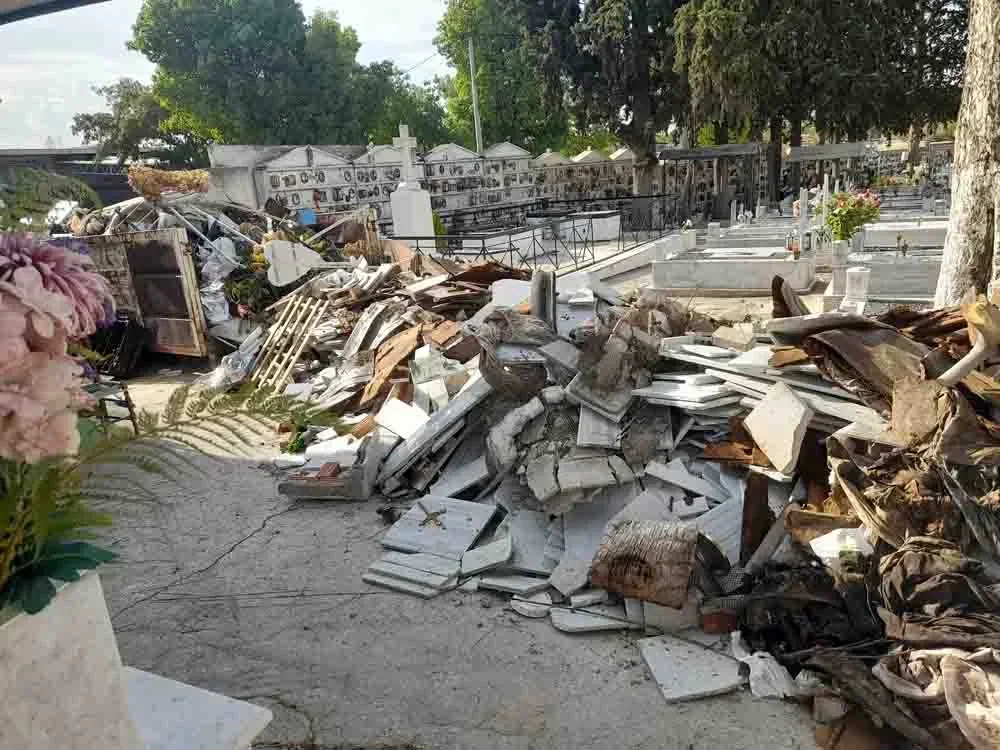 Όπως καταγγέλλει, η κατάσταση στο χώρο είναι άθλια με ευθύνη της δημοτικής Αρχής Παχατουρίδη που παραχώρησε σε ιδιωτική εταιρεία την αποκομιδή των απορριμμάτων από εκταφές, δημιουργώντας μία μικρή χωματερή μέσα στο κοιμητήριο με σορούς επικίνδυνων απορριμμάτων, «βάζοντας σε κίνδυνο την υγεία των εργαζομένων αλλά και των επισκεπτών».
