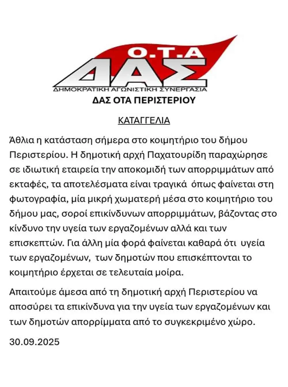 Η καταγγελία της ΔΑΣ ΟΤΑ δήμου Περιστερίου.