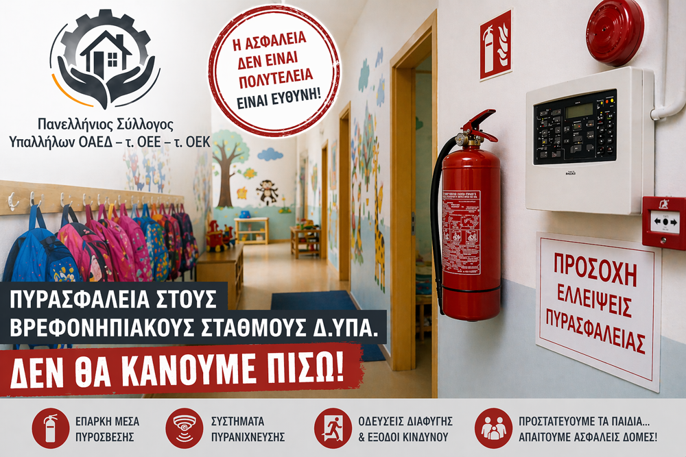 Ο ΠΑΝΣΥΠΟ απαιτεί άμεσα μέτρα από τη Διοίκηση της Δ.ΥΠ.Α. Η λειτουργία κάθε Βρεφονηπιακού Σταθμού που δεν πληροί τις νόμιμες προϋποθέσεις πυρασφάλειας πρέπει να ανασταλεί άμεσα, χωρίς καμία εξαίρεση και χωρίς καμία καθυστέρηση. Η προστασία της ζωής προηγείται κάθε διοικητικής ή λειτουργικής σκοπιμότητας.