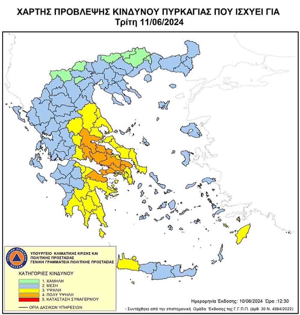 Πολύ υψηλός κίνδυνος πυρκαγιάς (κατηγορία κινδύνου 4) προβλέπεται αύριο Τρίτη 11 Ιουνίου, σε τρεις περιφέρειες της χώρας, σύμφωνα με το Χάρτη Πρόβλεψης Κινδύνου Πυρκαγιάς που εκδίδει η γενική γραμματεία Πολιτικής Προστασίας του υπουργείου Κλιματικής Κρίσης & Πολιτικής Προστασίας (civilprotection.gov.gr).